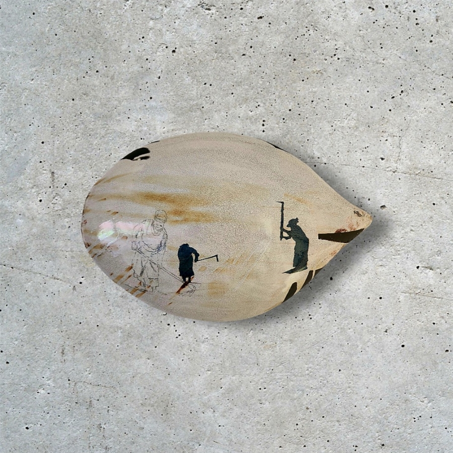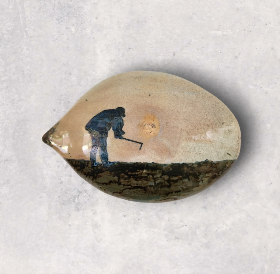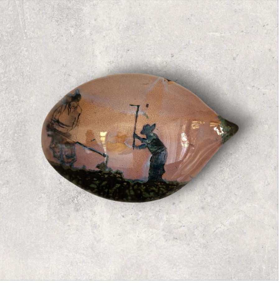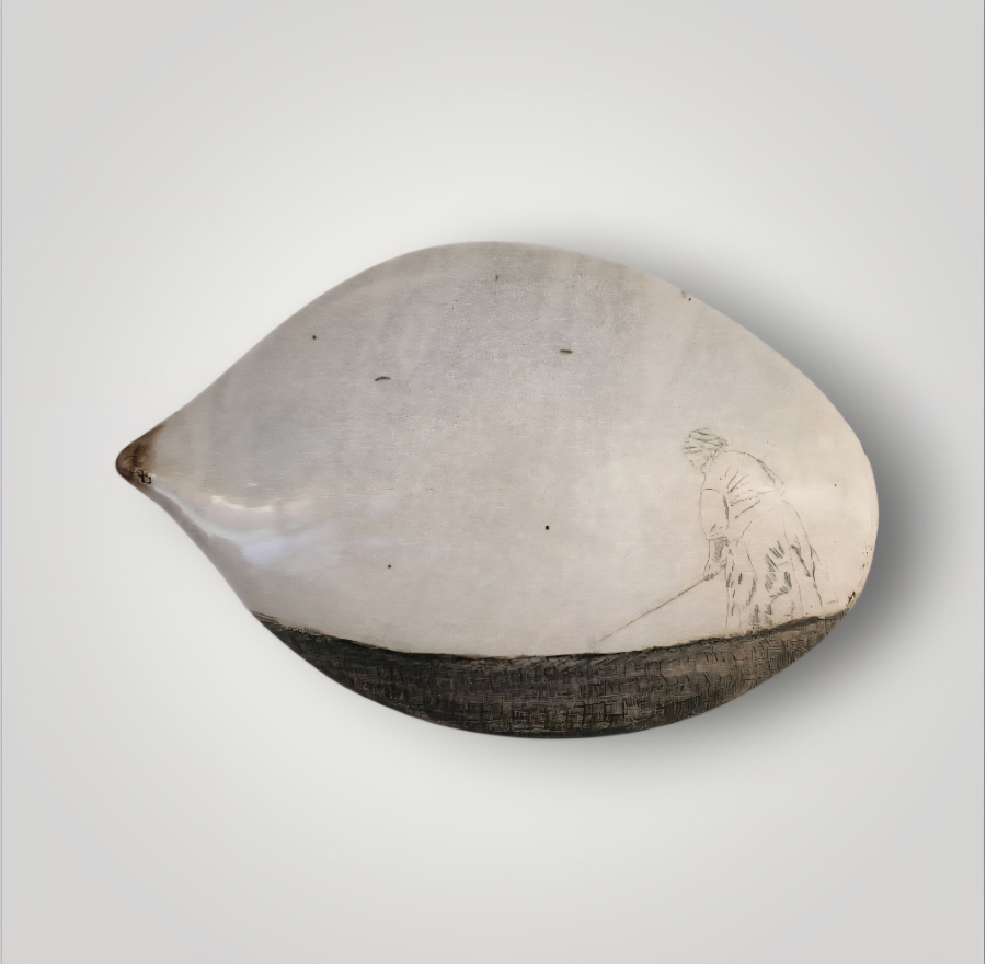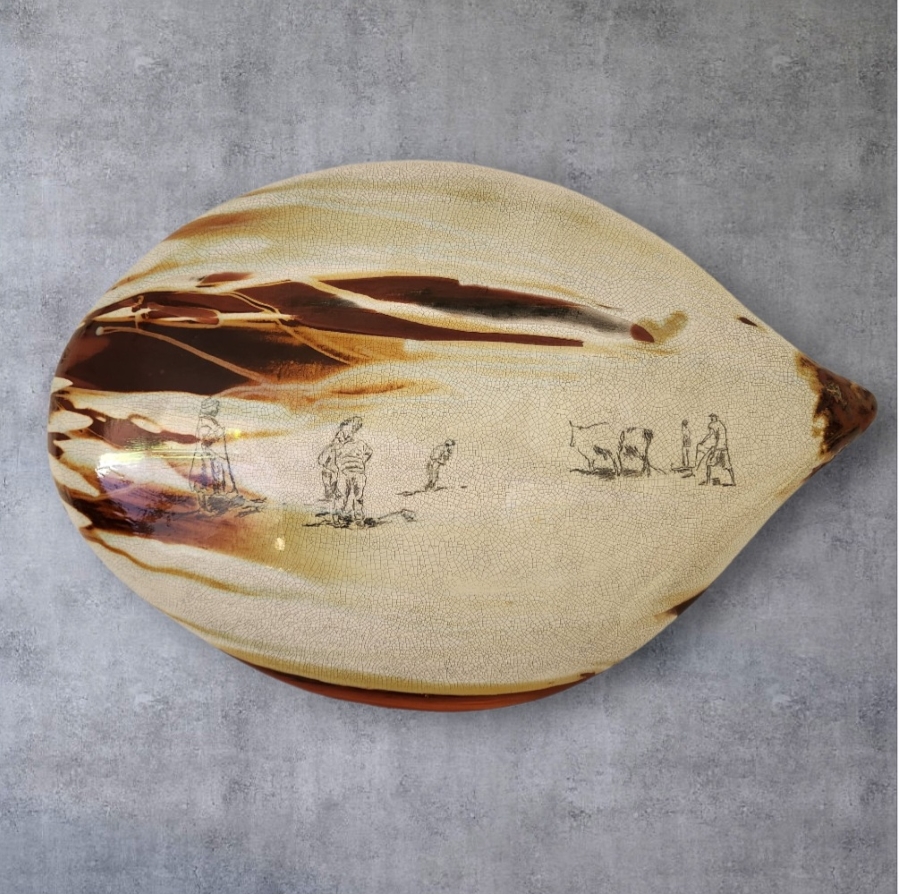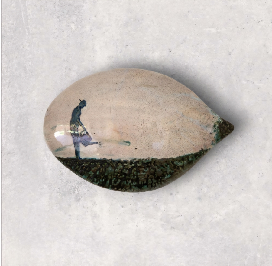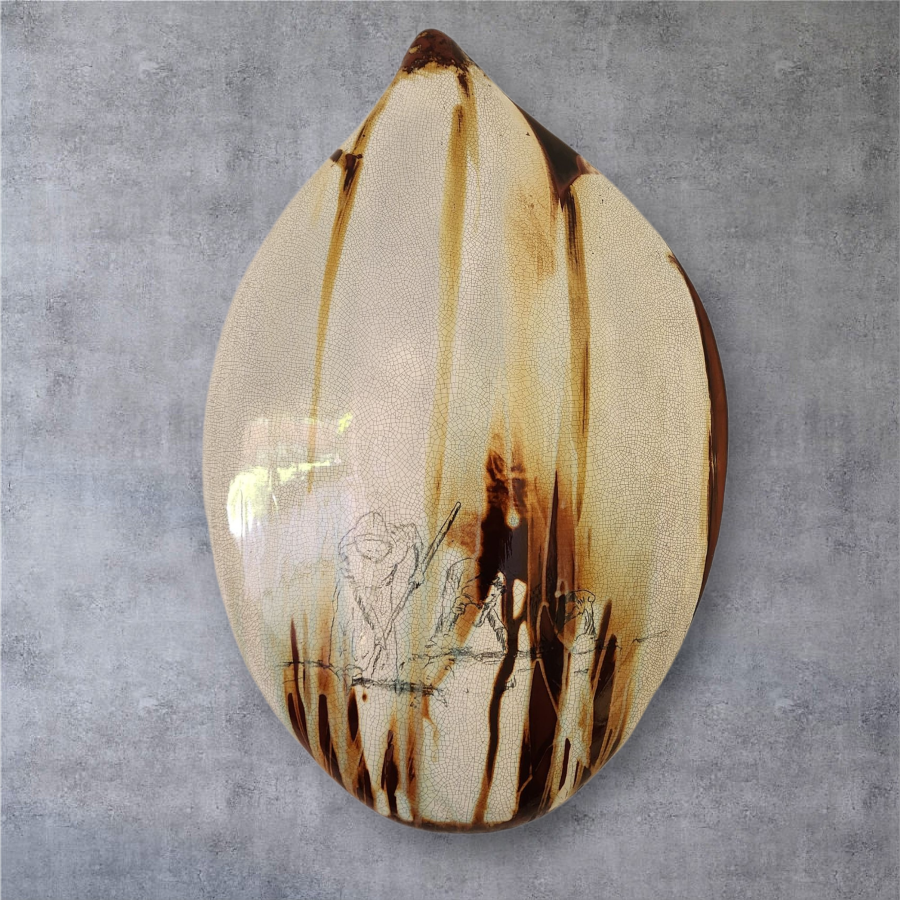 In this series, the seed shape becomes my primary symbol—an emblem of potential and renewal. Using a transparent raku glaze, I allow the drawn figures to emerge subtly from the surface, while the natural crackle of the raku firing process echoes the fractured condition of neglected land. The red tones created by ferric chloride reference the earth itself, grounding the work in both memory and materiality. The familiar sounds of raku firing, which I usually associate with energy and transformation, take on a new significance here: they become the imagined cry of the land, calling for care, restoration, and attention.